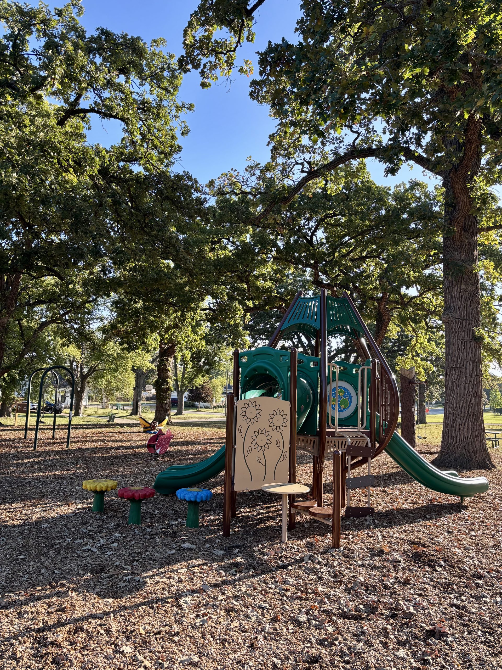 Salem Park is a 0.85-acre park located on Salem Boulevard. The playground, updated in 2025, features equipment for children ages 2–12, including slides, interactive play panels, flower step pods, a rocker, spinner, mushroom table with stools, an expression swing, a climb-on butterfly, and bucket and belt swings./