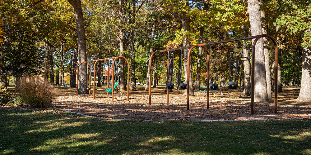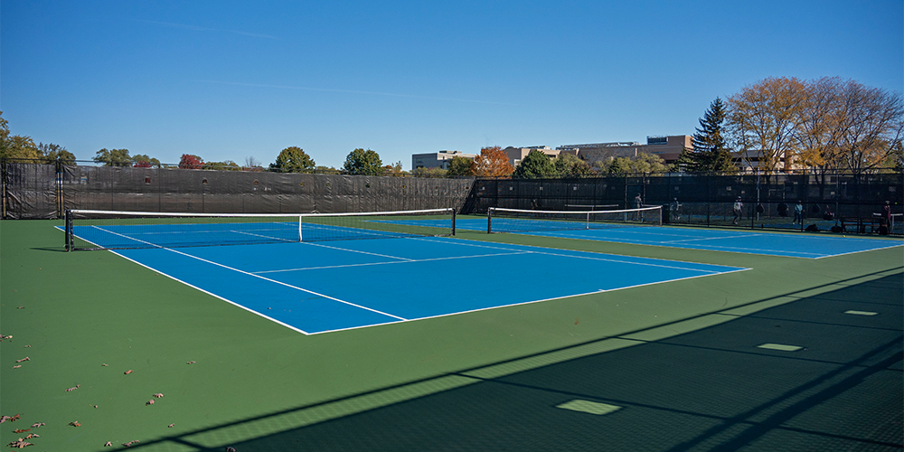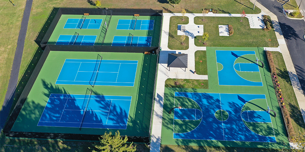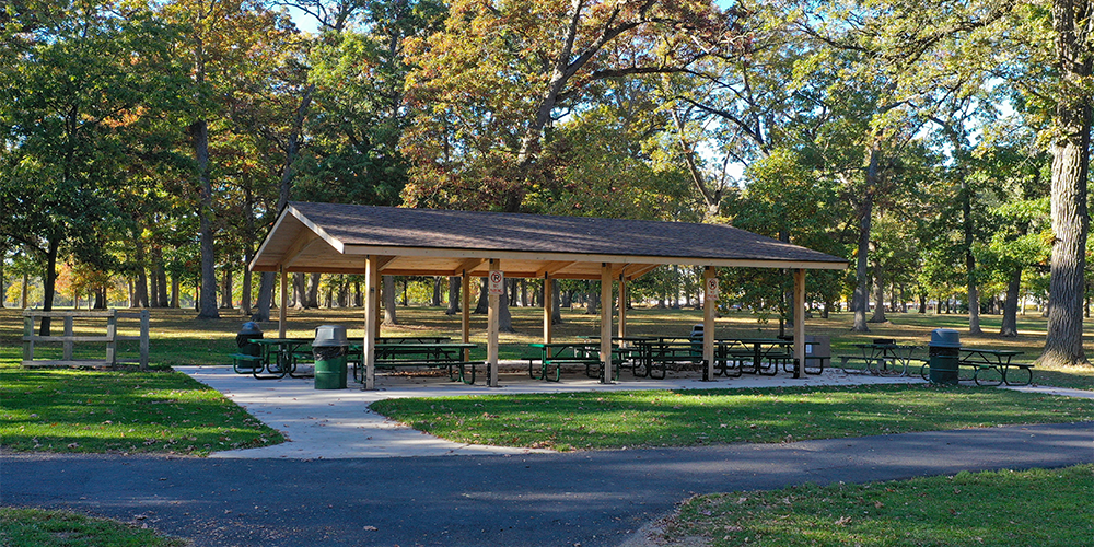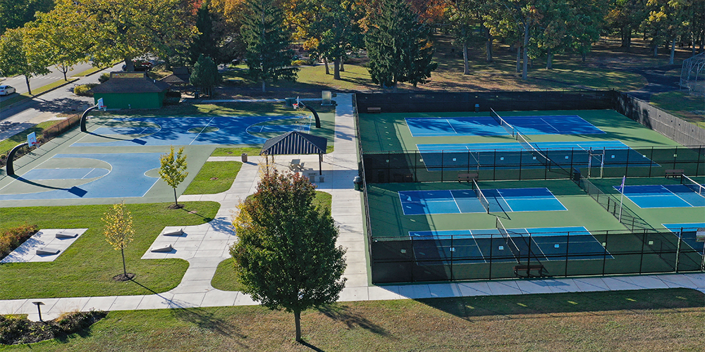 Park contains three picnic shelters, four tennis courts, basketball courts, two baseball diamonds,